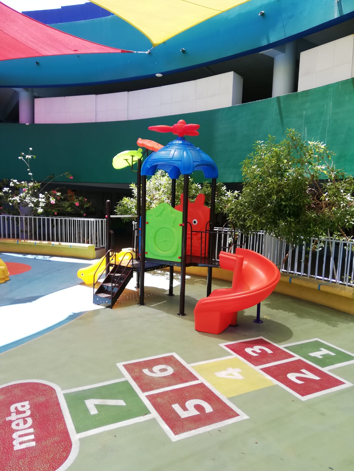 Piso de caucho, Toldo vela, bicicleteros, escaños, basureros y señaléticas